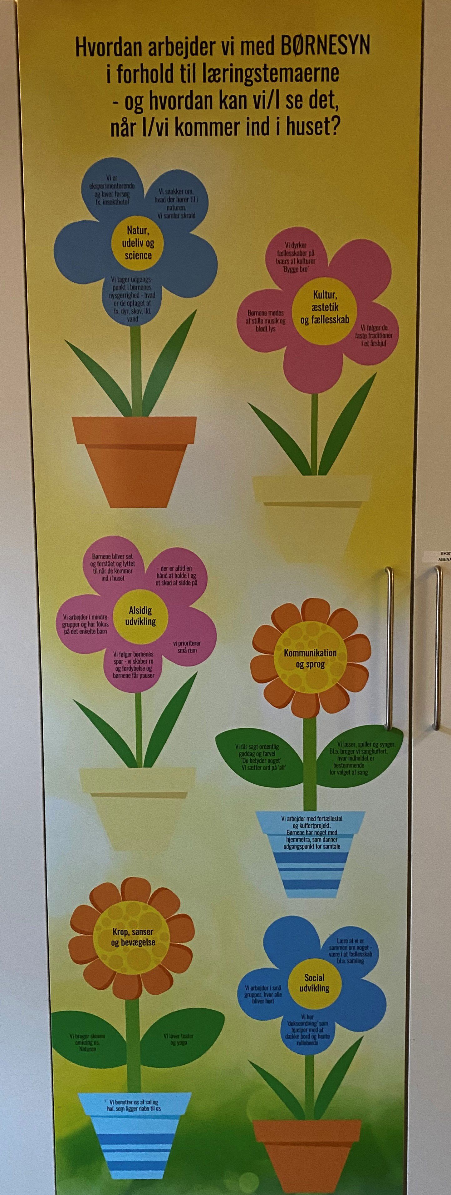 Vores grundsyn der danner udgangspunkt for vores læreplan. Vi har valgt en anden tilgang at beskrive selve læreplanen med. De enkelte læreplanstemaer beskriver vi som “blomster” der visuelt hænger i stor størrelse i institutionen, synlig for alle i huset. Dette underbygges af små blomster der hænger rundt om i huset og forklarer hvilket tema vi arbejder med på netop det enkelte sted/område